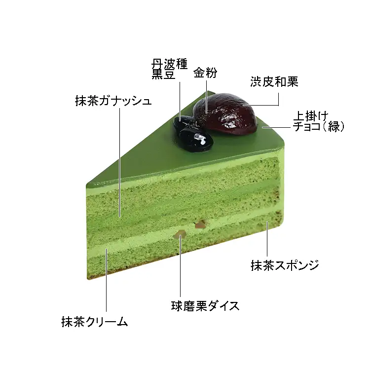 鹿児島県産一番茶抹茶使用。抹茶スポンジに抹茶のクリームとガナッシュをサンドした抹茶好きにはたまらない贅沢な抹茶ケーキ。中の和栗ダイスが食感のアクセント。