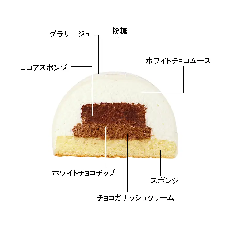 ホワイトチョコムースにチョコガナッシュを重ね、食感のアクセントにホワイトチョコチップをサンドしました。