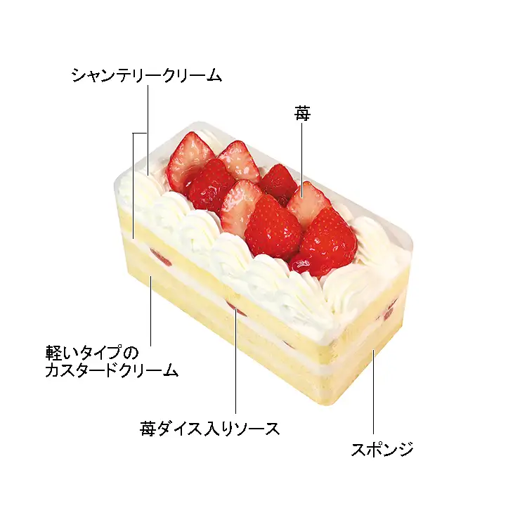 スポンジに軽いタイプのカスタードクリーム、苺ダイス入りソースを重ね苺をふんだんに飾りました。