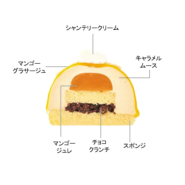 キャラメルムースに甘酸っぱいマンゴージュレを合わせました。チョコクランチが食感のアクセント。