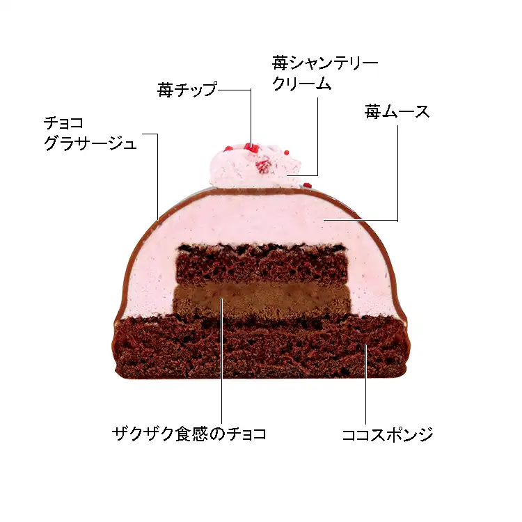 甘酸っぱい苺ムースでザクザク食感のチョコを包みチョコグラサージュで仕上げた、チョコと苺のハーモニーがたまらないドームケーキです。