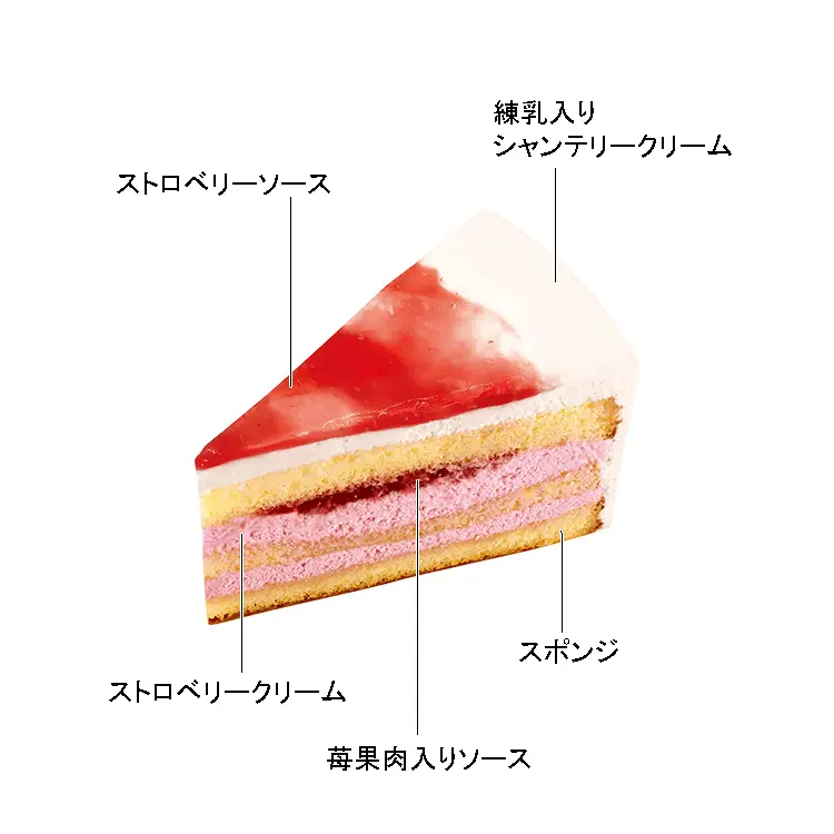 スポンジにストロベリークリームと苺果肉入りソースをサンドし、練乳入りシャンテリークリームを重ねることでミルキーの味わいを表現しました。上面をストロベリーソースでマーブル模様に仕上げた苺ミルキー風味のケーキです。