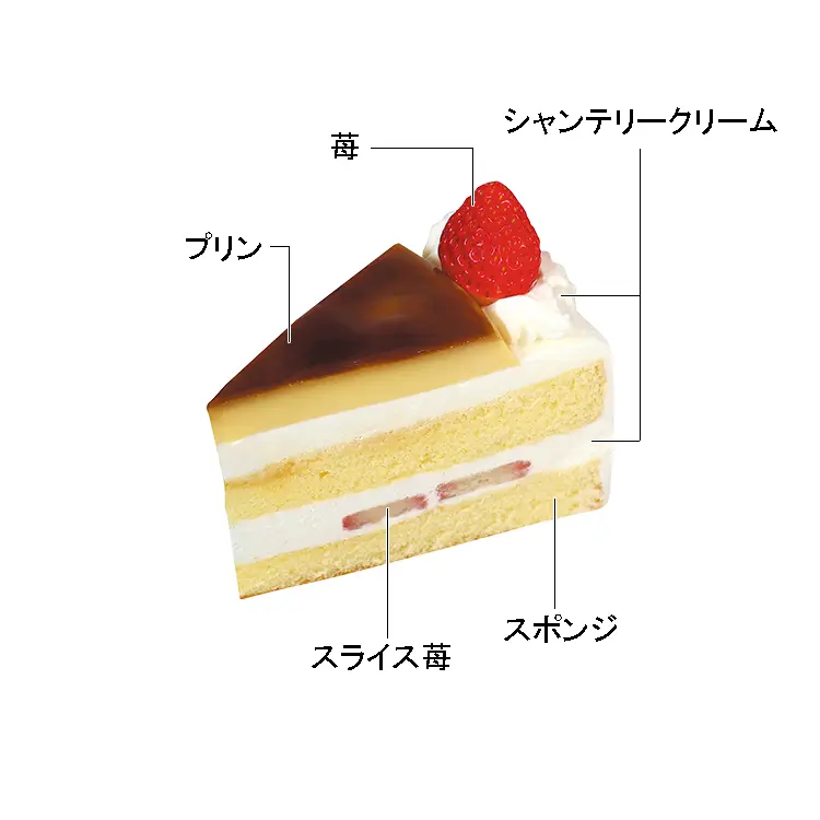 シャンテリークリームにスライス苺をサンドしたショートケーキに、プリンをのせたよくばりスイーツです。