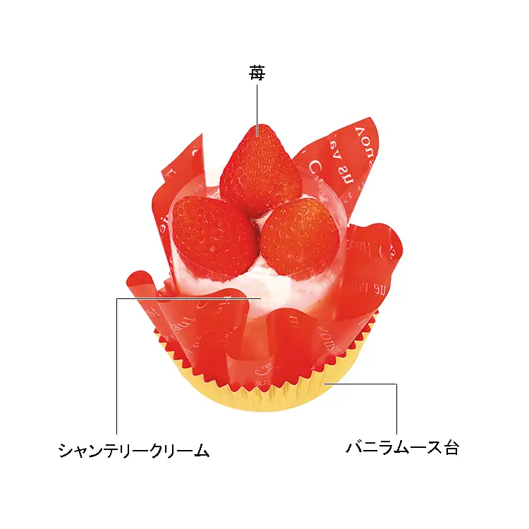 バニラムースにシャンテリークリームを重ね、苺を贅沢にゴロっと飾りました。