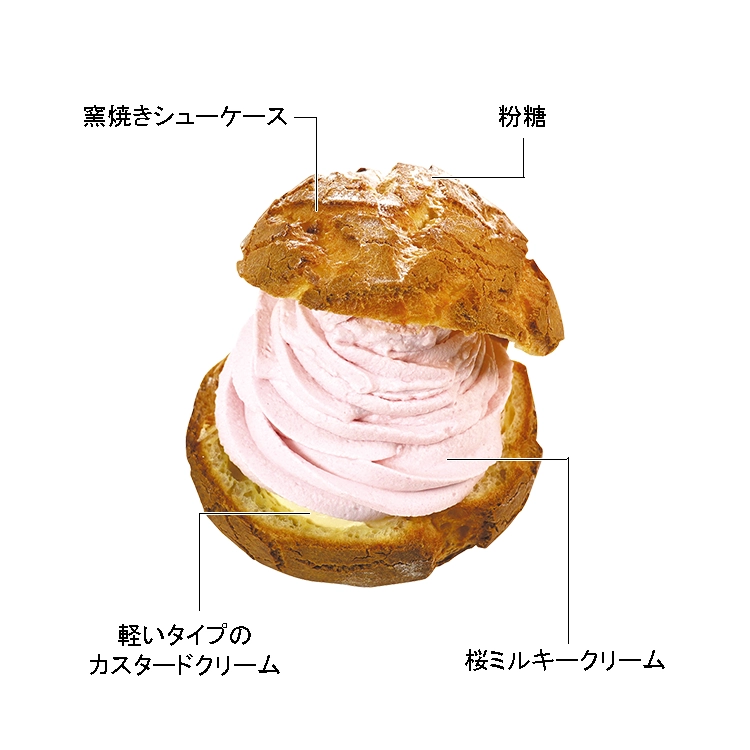 窯焼きシューケースに軽いタイプのカスタードクリームと、神奈川県産八重桜を使用した桜ミルキークリームをたっぷり絞りました。一口頬張るとクリームがあふれ出す、桜のやさしい香りと満足感を存分に楽しめる一品です。