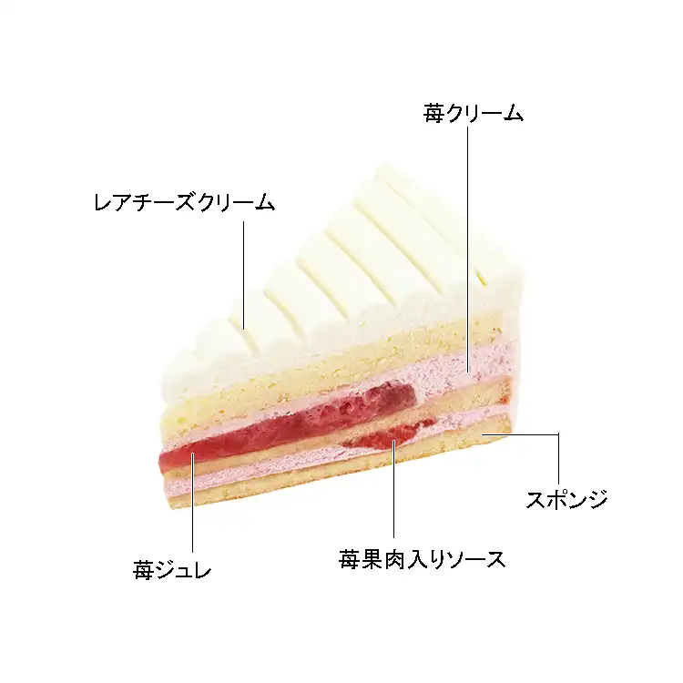 苺クリームと苺果肉入りソース、苺ジュレをサンドし、レアチーズクリームで仕上げました。
