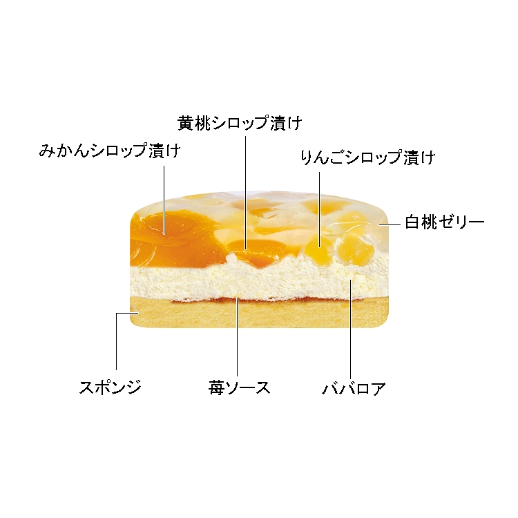スポンジに苺ソースとババロア生地を重ね、黄桃・りんご・みかんのシロップ漬けをトッピングし、白桃のゼリーで仕上げました。