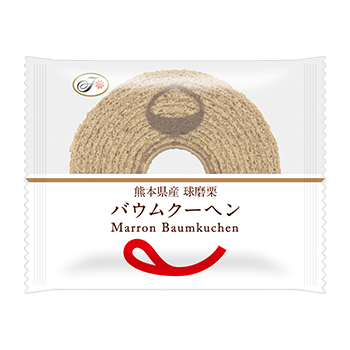 熊本県産球磨栗のペーストを練りこんだ生地を一層一層丁寧に焼き上げたバウムクーヘンです。栗のイラスト入り。
