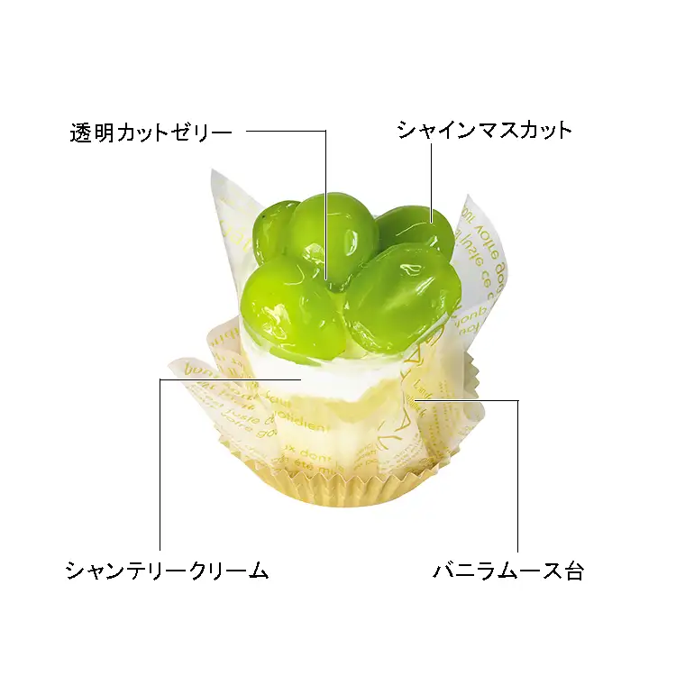 バニラムースにマスカットクリームを絞り、透明カットゼリーとシャインマスカットを飾りました。