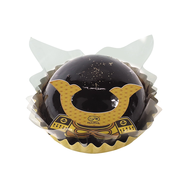 ココアスポンジにプリン、チョコムースを重ね、チョコグラサージュでコーティングしたかぶと型のケーキです。