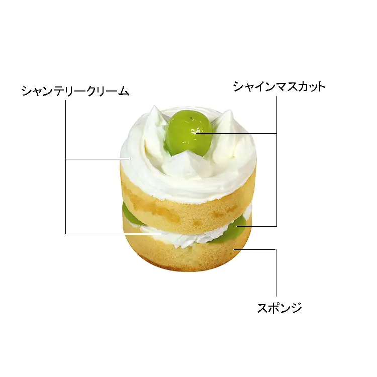 焼き目の見えるスポンジにシャンテリークリームと半切シャインマスカットをサンドしたレトロかわいいショートケーキです。
