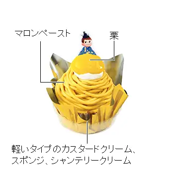 軽いタイプのカスタードクリームを注入したスポンジに、シャンテリークリームを絞り、マロンペーストを重ねました。