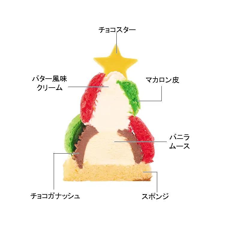 バニラムース、チョコガナッシュ、バター風味クリームを絞り、クリスマスカラーのマカロン皮を飾りました。