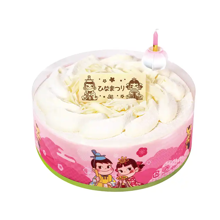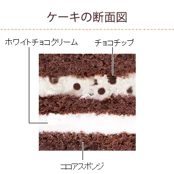 ホワイトチョコクリームとソフトなココアスポンジ、食感が特徴のチョコチップの組み合わせが楽しめます。ペコポコデザインのチョコプレート、ぼんぼりローソクを飾りました。