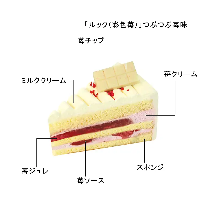 スポンジに苺クリーム、苺ソース、苺ジュレをサンドし、上面にはミルククリームと苺チップ、「ルック(彩色苺)」のつぶつぶ苺味を飾りました。