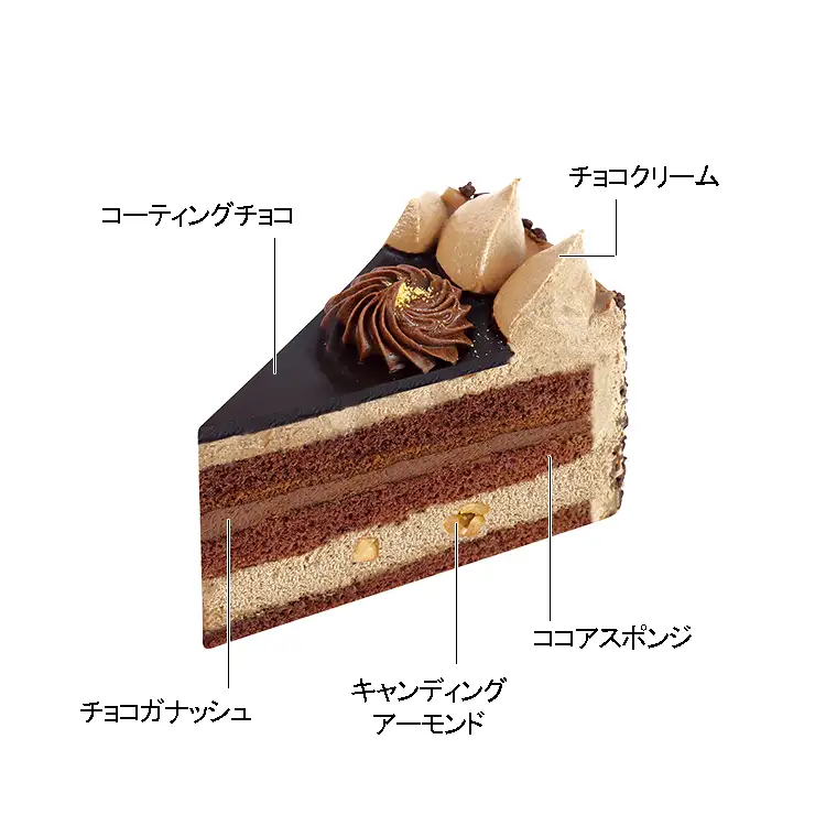 ココアスポンジにチョコクリームと濃厚なチョコガナッシュをサンドしました。キャンディングアーモンドがアクセント。