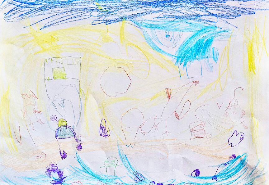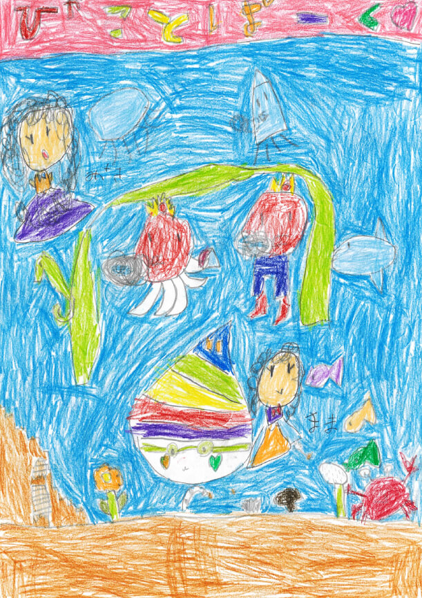 家族で初めて行った海の絵を描きました。海の生き物を見つけたり、大きな波が来て楽しかったです。海の中にはたくさんの魚がいるだろうな。と思い、赤い魚やクラゲ、カメも描きました。