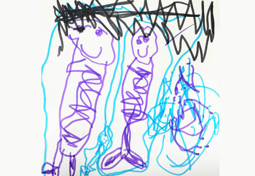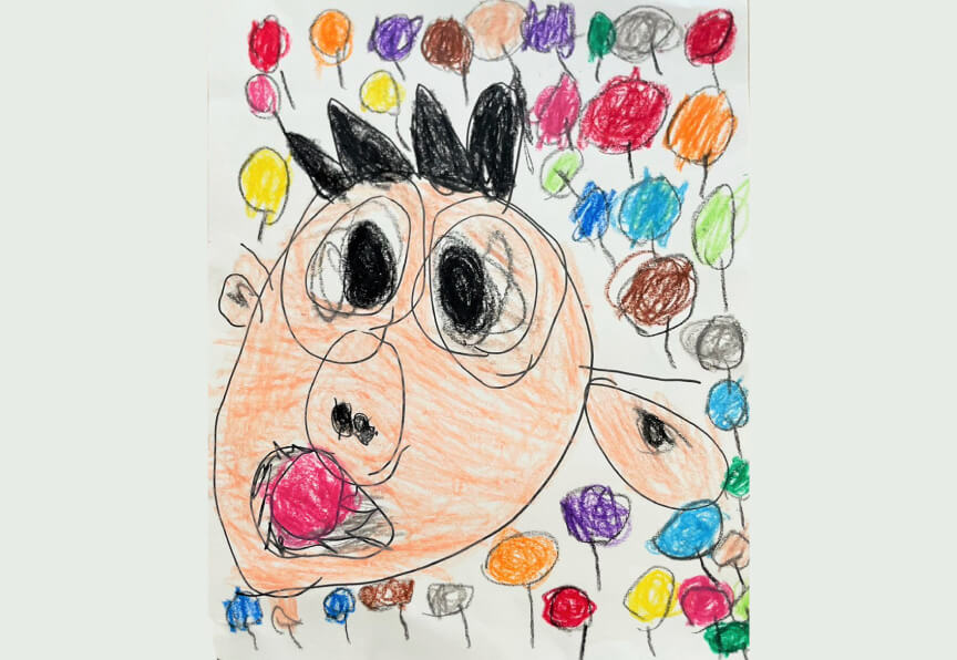 私(母)の顔を初めて描いてくれました。普段めがねをかけているので、「がんばって、めがねかいた」と言ってくれました。めがねがちゃんと耳にかけてあり、よく観察しているなぁと感心し、今回応募しました。