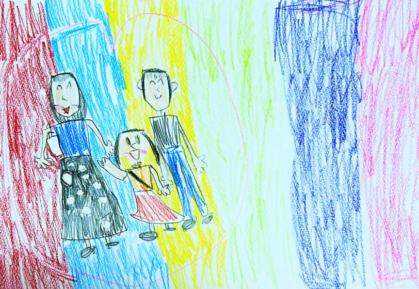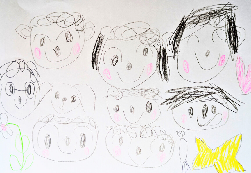 おじいちゃん、おばあちゃん、パパ、ママ、自分の絵を描いてくれました。みんなニコニコ笑っています。おばあちゃんとママはおしゃれをしてドレスを着ているそうです。