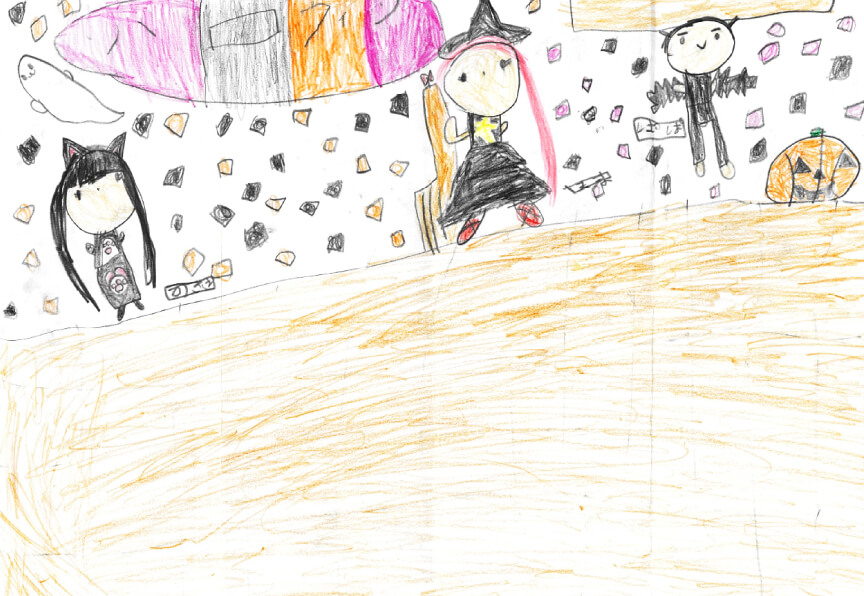 私、おじいちゃん、おばあちゃん、おとうさん、おかあさん、いもうと皆で、お菓子やお花がいっぱいある、知らない世界に行きたいと思いました。そして知らない世界で友達ができました。みんなではいチーズ! みんなでハッピー!