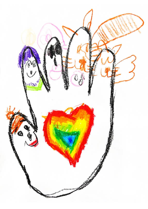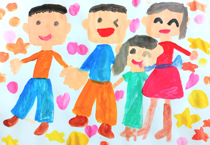 ピンクは優しさ、黄色は元気、黄緑は長生き、青は海のような心の広さを思い浮かべて、家族の絵をかきました。