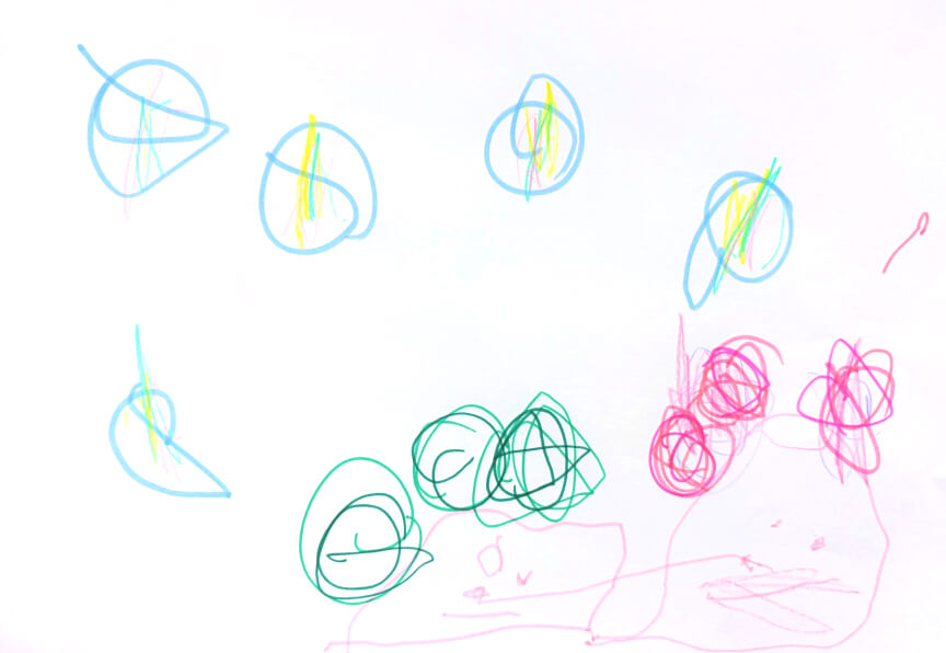 雨上がりの水玉で友達と遊んでいたら、「すってんころりん」して滑ったところと、園庭の桑の実を取って食べた事を描いたそうです。4歳児が見えている世界。