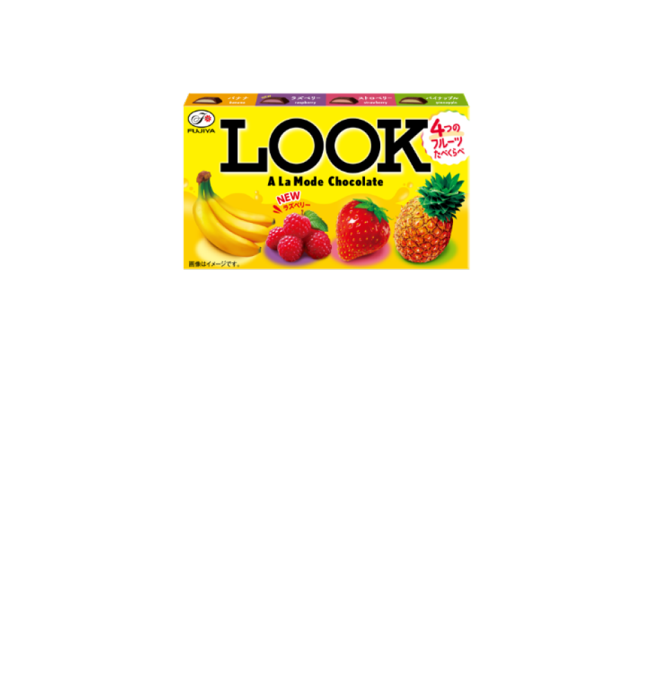 「バナナ」、「ラズベリー」、「ストロベリー」、「パイナップル」のアソートチョコレート!1箱で4種類のフルーツ食べ比べがお楽しみいただけます。