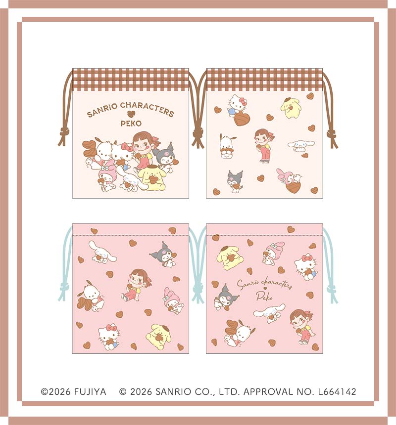 各¥880表裏にペコちゃんとサンリオキャラクターズのデザインが入った2種類の巾着。