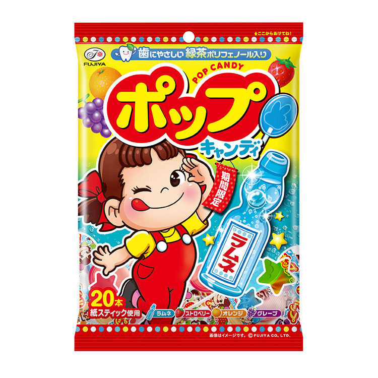 グレープ、オレンジ、ストロベリーと期間限定「ラムネ」の4種の味を楽しめて、歯にやさしい緑茶ポリフェノールを配合した棒付きキャンディです。